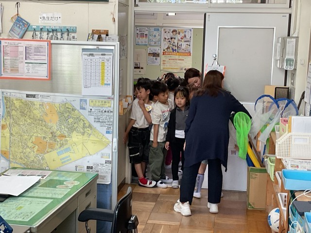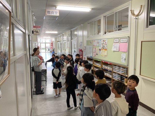 1年生は校内探検で、職員室に用事を伝える言い方を学びました。