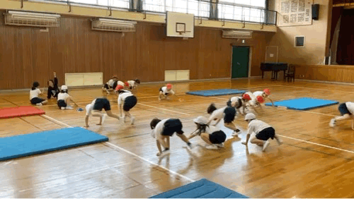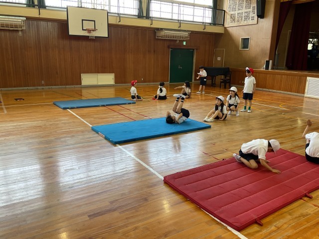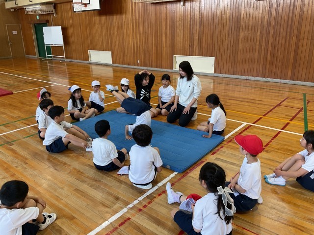 お手本の子の技を見て、後転するには何が必要?と聞かれると、「頭を丸める」や「おへそを見る」等、子ども達から意見が出ました。