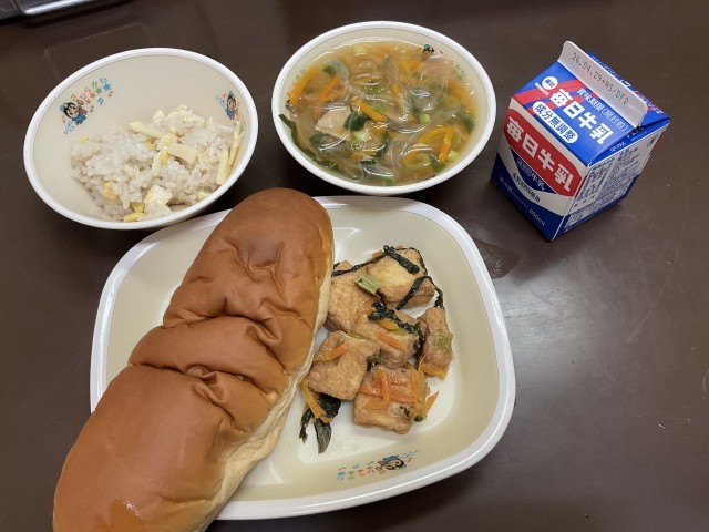 【献立】たけのこおこわ、厚揚げ味噌炒め、春雨のスープ、黒糖パン、牛乳