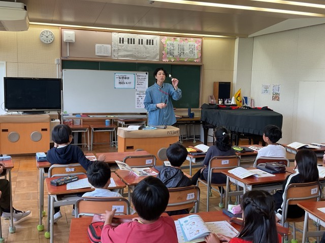 部品の説明の際に、ヘッドだけで色々な音が出せることを聞き、実際音楽の先生が演奏してみると、子ども達はとても驚いていました。