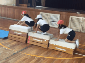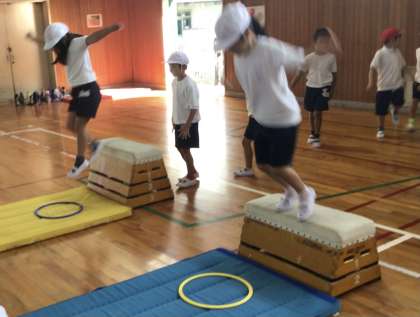 初めての「とび箱」に挑戦です。目の前にある「とび箱」になれるためにも、サーキットを通じて、体の動かし方を学んでいます。まずは楽しく体を動かすところからです。
