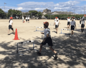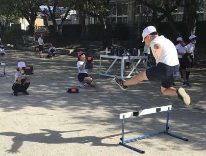 「ハードル走」では、まずどんな跳び方が、速く走れるかを考えるところから始まっています。実際に色々な跳び方を試しながら、自分で考えます。友達のアドバイスや動画をみながら、主体的な学習を進めています。