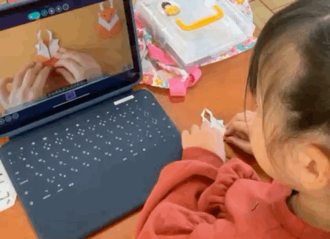 動画で確認しながら、自分のペースで折り紙を完成させています。クリスマスの飾り付け...