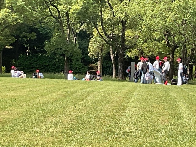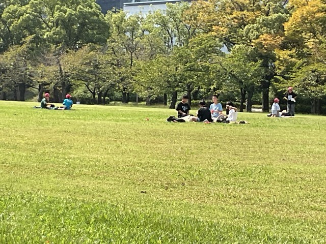 いつもより1時間ほど早いお弁当タイム。芝生の広がっている西の丸庭園で記念写真を撮ってから、お弁当を頂きました!
