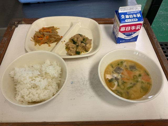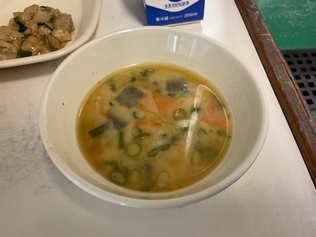 今日のメニューは、呉汁、やきとり、切り干し大根の煮物、ご飯、牛乳でした。