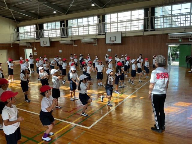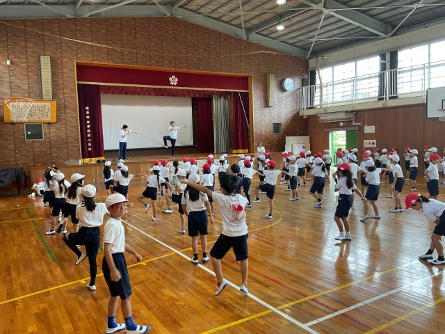 クラスごとに立ち上がるところから演技が始まります。なかなかリズムに合わせてクラスごとに揃えるのは難しいようです。まだ1回目ですので、本番までに仕上げていきましょう!!