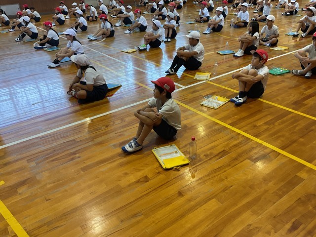 最後の先生のお話のとき、ペットボトルのカチャカチャの音が気になった先生が、「100人以上が一緒に行動するので先生の話を聞くときは、ペットボトルを横に置こう。」と言った後の子ども達の様子です。