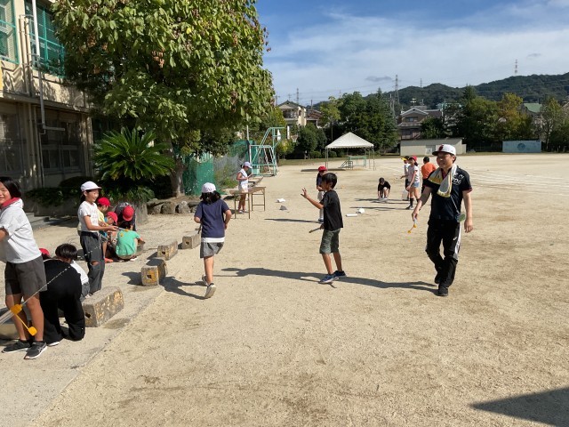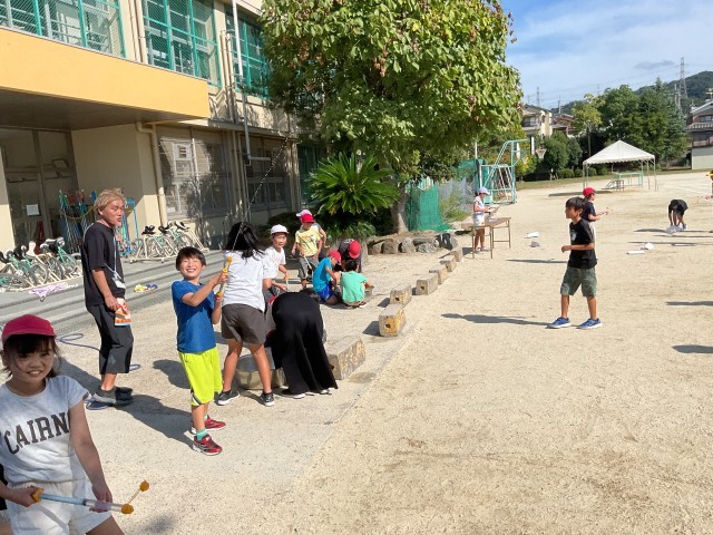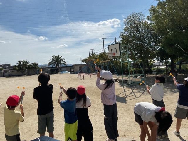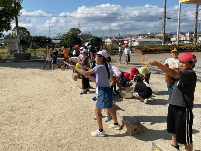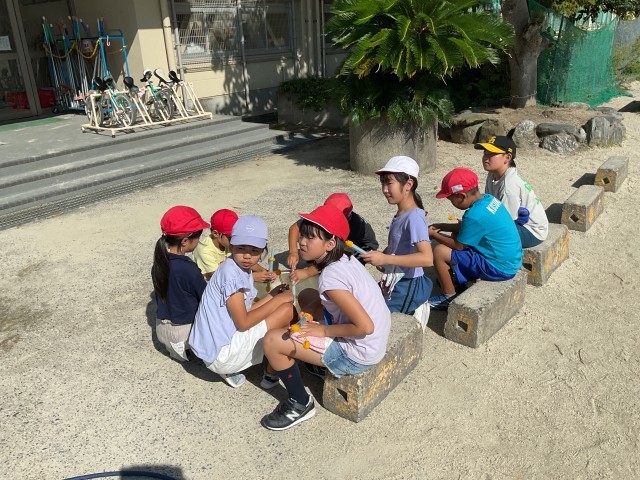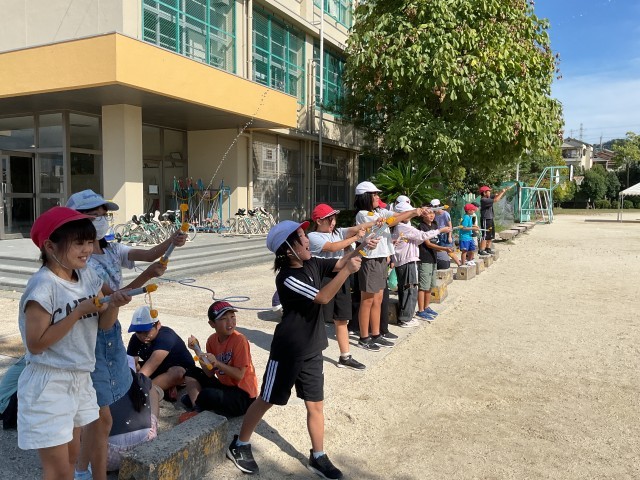 強い日差しの中、水を使って気持ちよさそうに実験をしていました。
