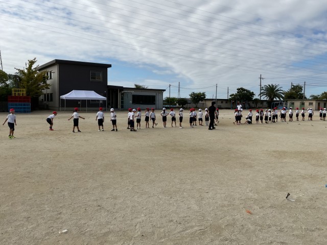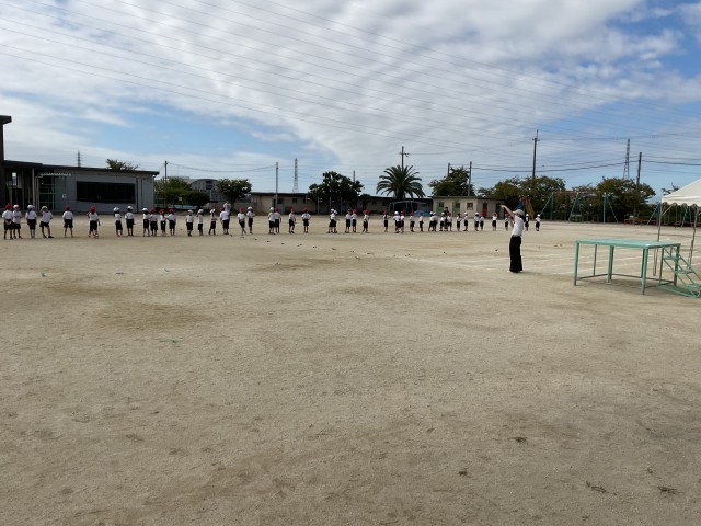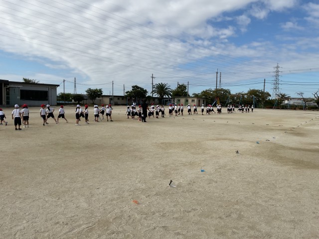 秋晴れの中、1年生が運動場で隊形移動等を中心とした、表現運動に一生懸命取り組んでいました。可愛く1年生らしいダンスが完成することを楽しみにしています。