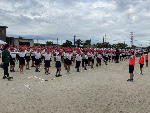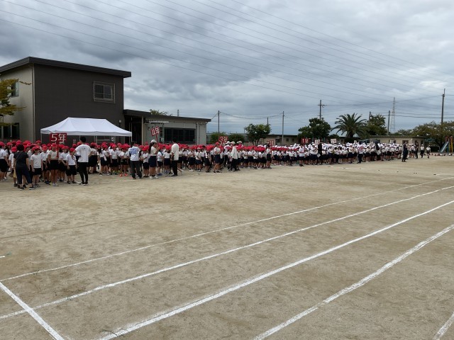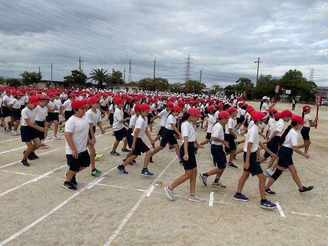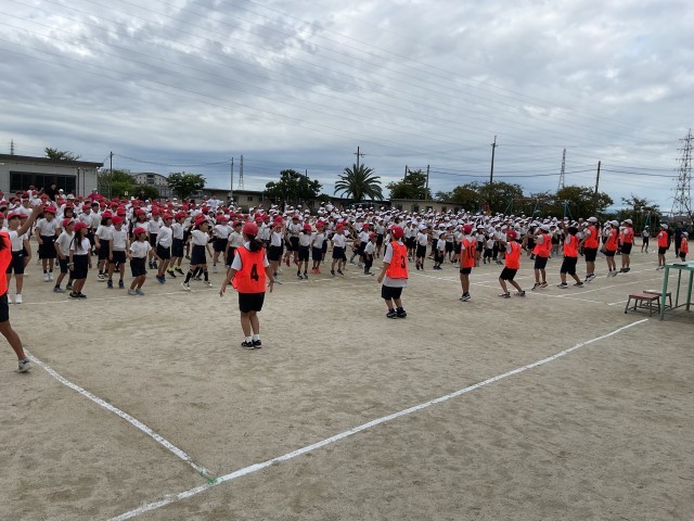 雨が心配されましたが、予定通り涼しい中で1時間目に運動会の全体練習を実施することができました。