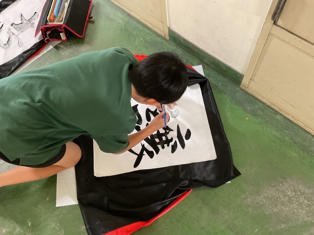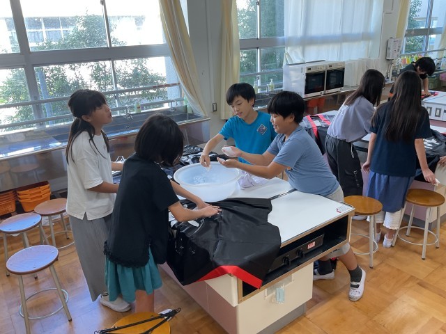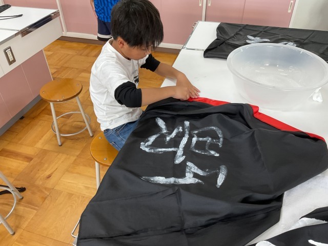運動会で使う法被を作りましたが、その時に飛び散ってしまった絵の具を家庭科室で擦って消す作業をしていました。