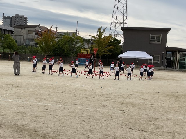 1年生の団体競技は玉入れです。1年生らしくミャクミャクのリズムと歌に合わせて可愛く踊りながら玉入れを行います。
