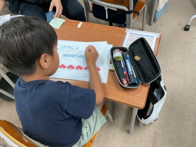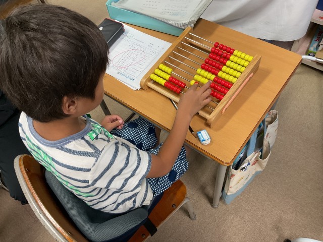 かけ算の数の増減を視覚化するために100玉そろばんを活用しています。100玉そろばんを使う子、プリントをどんどん解いていく子それぞれの課題に対して真剣に取り組んでいました。