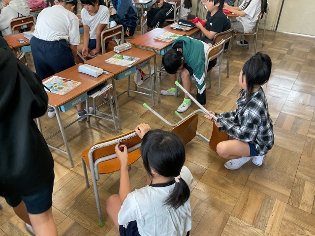 また、児童用の運動会プログラムを配ったり、放課後に運動場にイスを出す準備をしたりしていました。自分の椅子がわかるように出席番号のシールを貼ったり、イスの脚を補強したりもしていました。