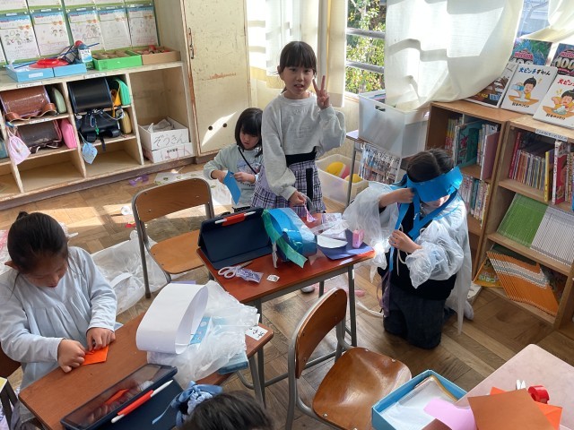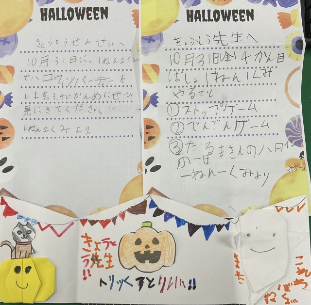 10/30(木)1年生 明日はハロウィン 公開日 2025/10/30 更新日 2025/10/30 1年生 1年生が明日のハロウィンパーティーに向けて準備を進めていました。折り紙でカボチャやお化けを作ったり、おばけの衣装を作ったりしていました。かわいい招待状までいただき、明日が楽しみです! +4 いいね(0)