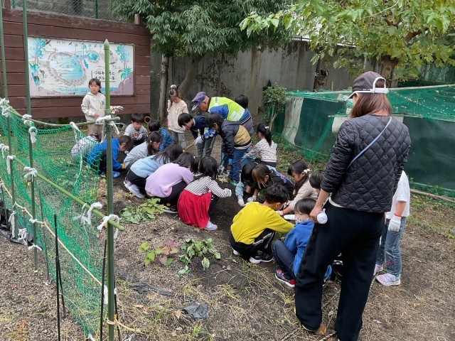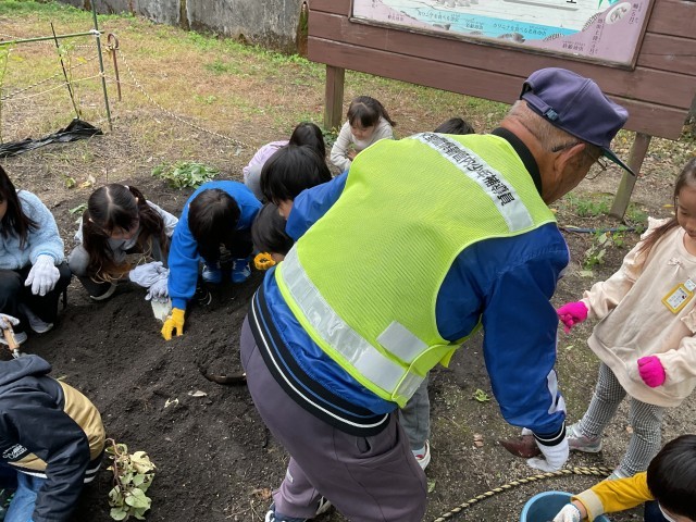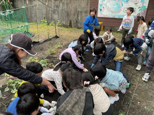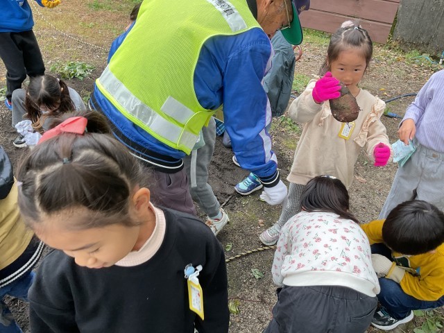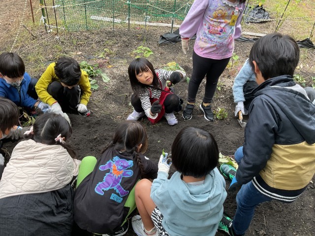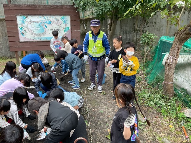 社会人講師の牧野さんを中心に校内の畑で育てていただいている、さつまいもが実り1年生が芋掘り体験を行いました。とっても大きなお芋が取れたと子どもたちは大喜びです。土の中には色んな幼虫がいて少し怖がっている子どももいましたが、楽しい体験をさせていただきました。この後、とれた芋を使って調理する予定です。