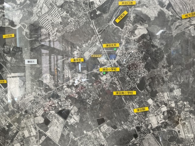津田地区の昔の地図を見て「津田南小はまだない!」「山手はまだ森や!」と言っていました。