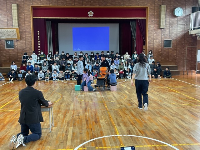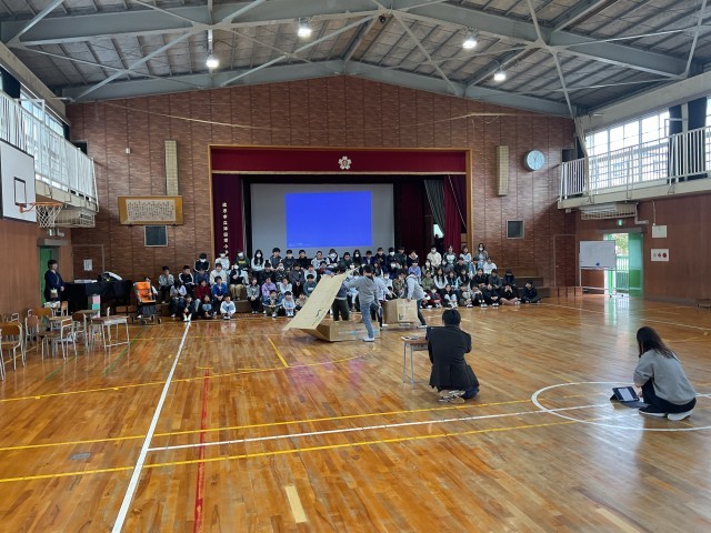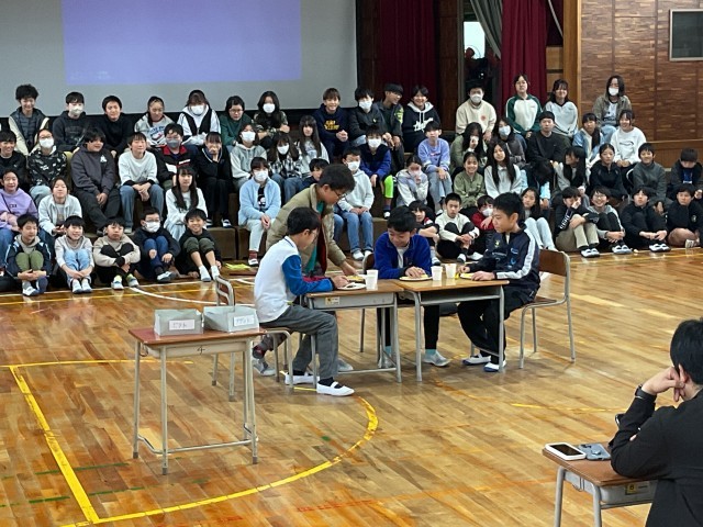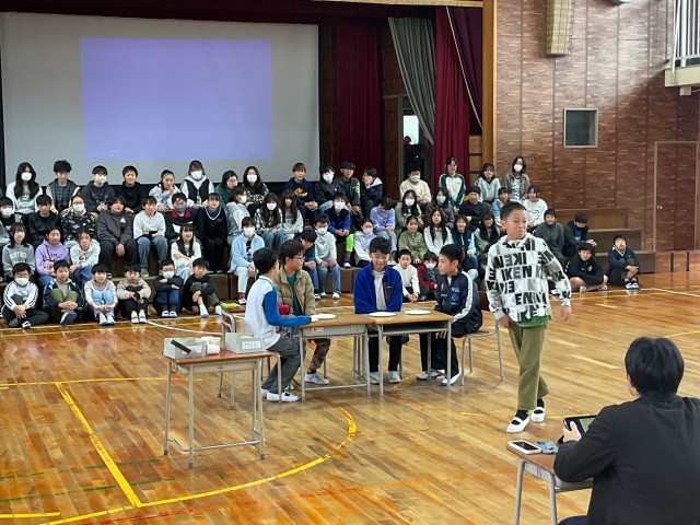 11/13(木)6年生 修学旅行の様子が目に浮かびます! 公開日 2025/11/13 更新日 2025/11/13 6年生 修学旅行の報告会の練習をしていました。見た時は朝のバイキングの様子の劇でした。「バイキングにテンション上がって、取り過ぎるなよー!」という先生役の子のセリフがありました。朝の先生と子ども達の様子が目に浮かびました。小物の準備もバッチリです! +3 いいね(0)