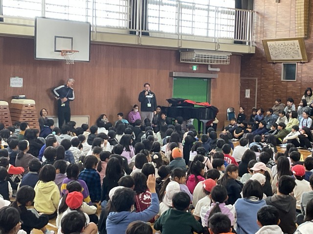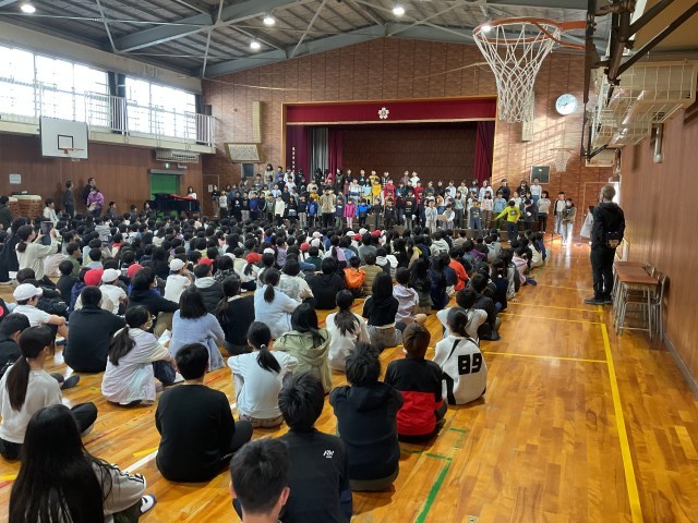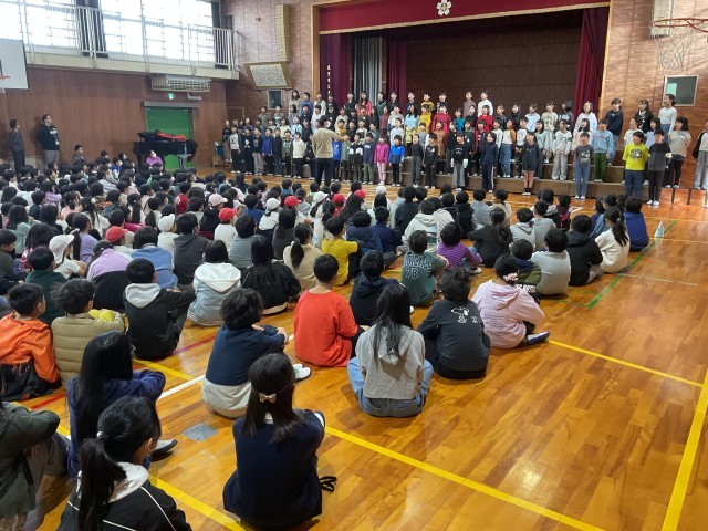 本日の児童朝会では、4年生が明日枚方市合同音楽会に出演する合唱を全校児童の前で披露しました。美しい歌声が体育館に響き渡りました。これまで音楽の授業で取り組んできた成果ですね!明日の本番もしっかりと持っている力を発揮しましょう。その後、昨日から3週間本校に来ていただくNETのダニエルが全校児童の前で自己紹介していただきました。