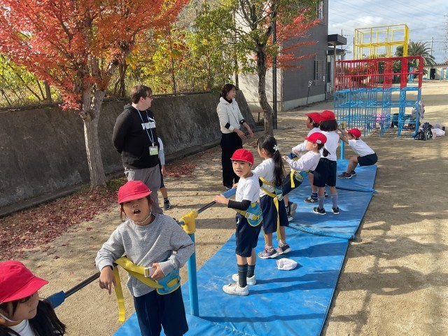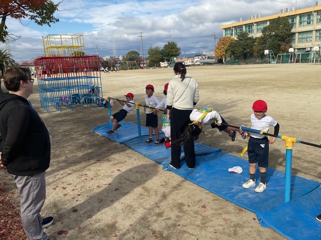 11/19(水)1年生 ダニエル先生といっしょ 公開日 2025/11/19 更新日 2025/11/19 1年生 月曜日からきてくれているダニエル先生と体育の授業をしていました。鉄棒と走り幅跳びに分かれて体を動かします。地域の方と学級閉鎖中の隣のクラスの先生も協力していただきながら、大人4人体制というなんともぜいたくな体育の授業となりました。 +2 いいね(0)