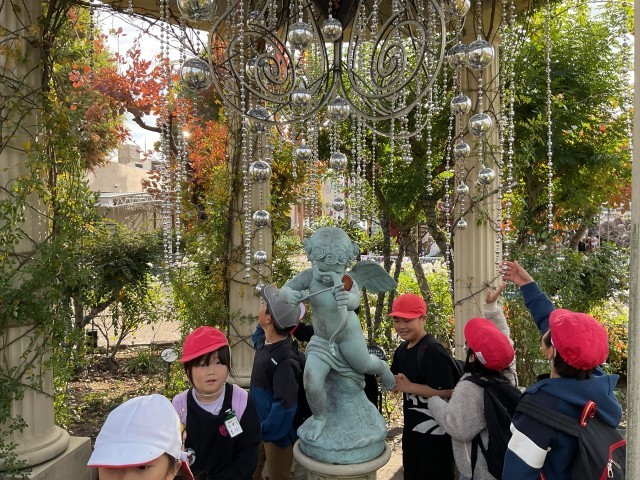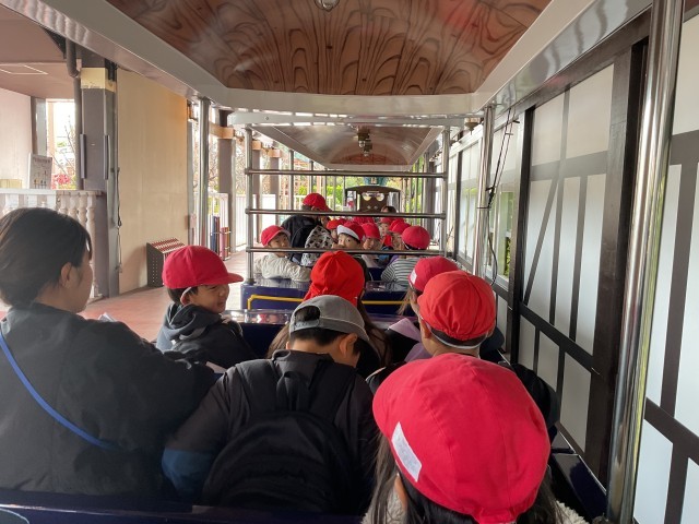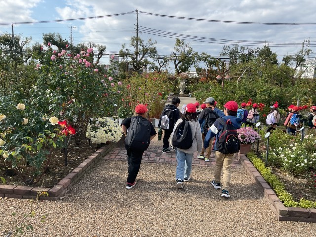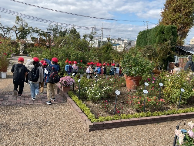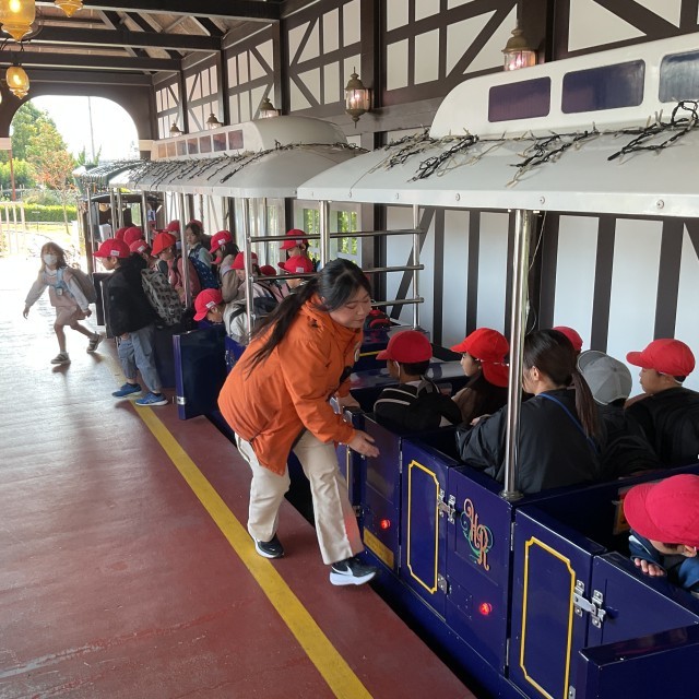 お弁当を食べたあとは、ノームトレインに乗って園内を観覧したり、バラ園を散策して綺麗なバラをたくさん鑑賞したり、集合写真を撮影したりしました。バラのいい香りが広がっていて、花に鼻を近づけて匂いを嗅いでいる子もいました。