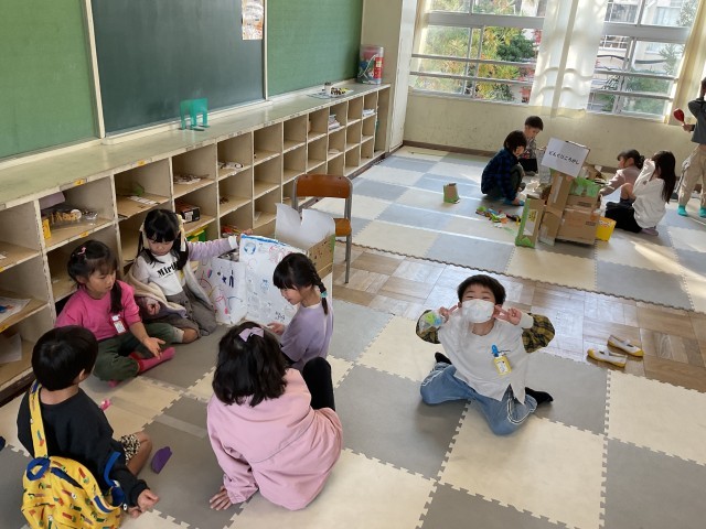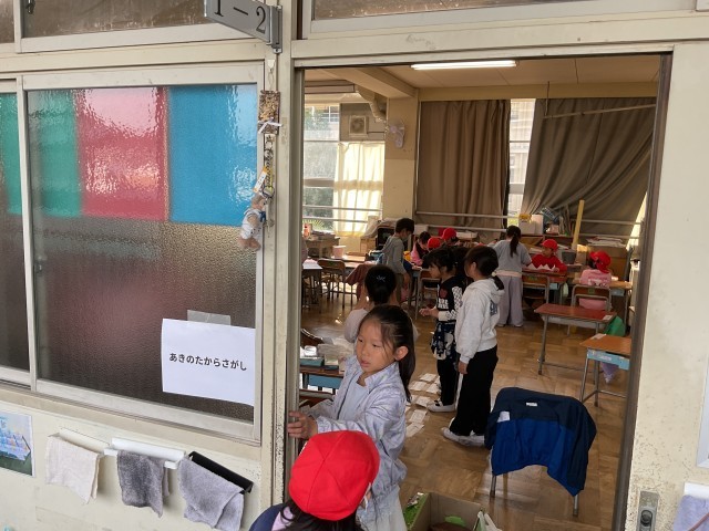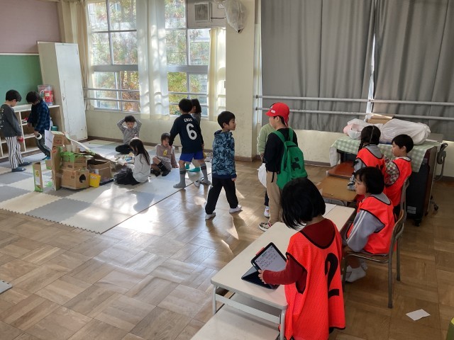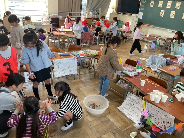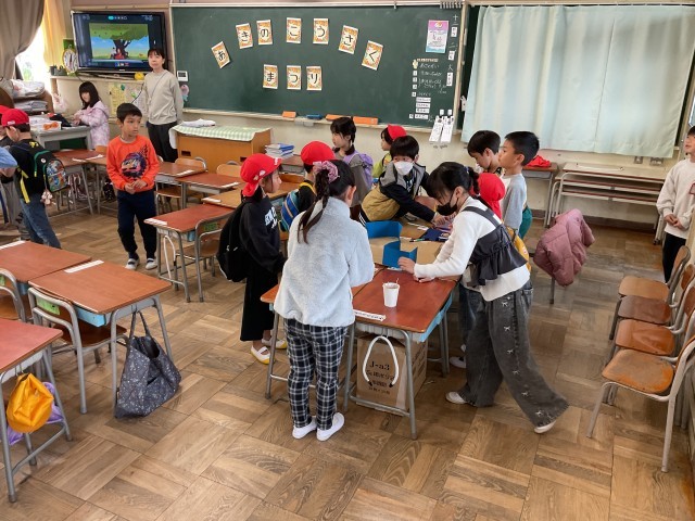 学級閉鎖で延期となっていた、まりも保育園との交流会を行いました。今回は小学校に来てもらって3つの教室を使って「秋の工作祭り」を開催しました。1年生の子どもたちがお兄さんお姉さんとして保育園の年長さんをおもてなししました。宝探しなどのたくさんのゲームコーナーや体験するブースがあり仲良く交流することができました。