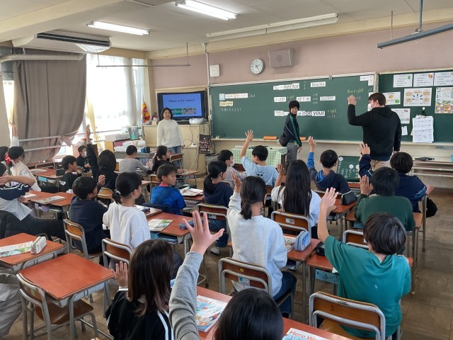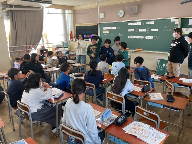 教室に戻って来た班を英語でお宝の席まで案内します。