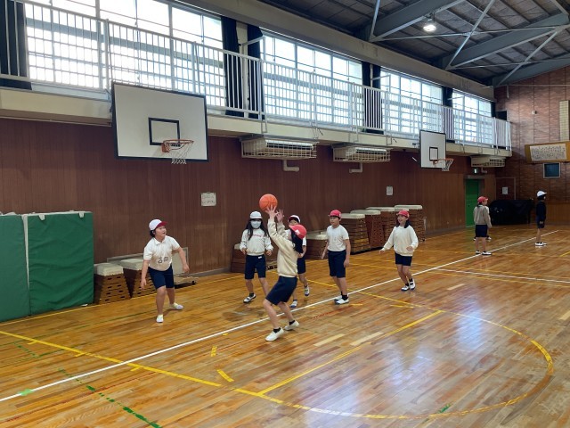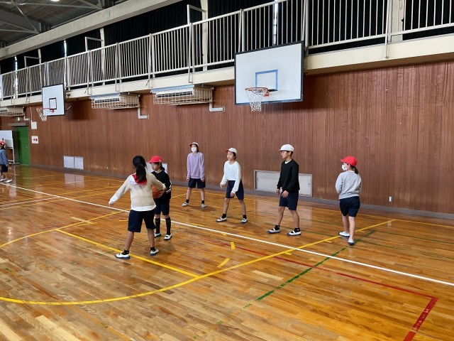 ハーフコートで守備側のメンバーの1人はコート外のコーンを触って体育館のドアをタッチしてから守備に加わるというルールで練習をしていました。