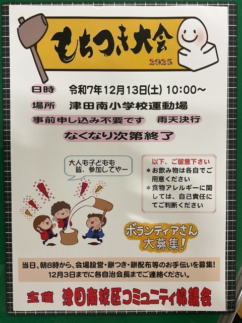 みなさんお楽しみのコミュニティ主催もちつき大会が明日13日(土)10:00より津田南小学校運動場で開催されます。