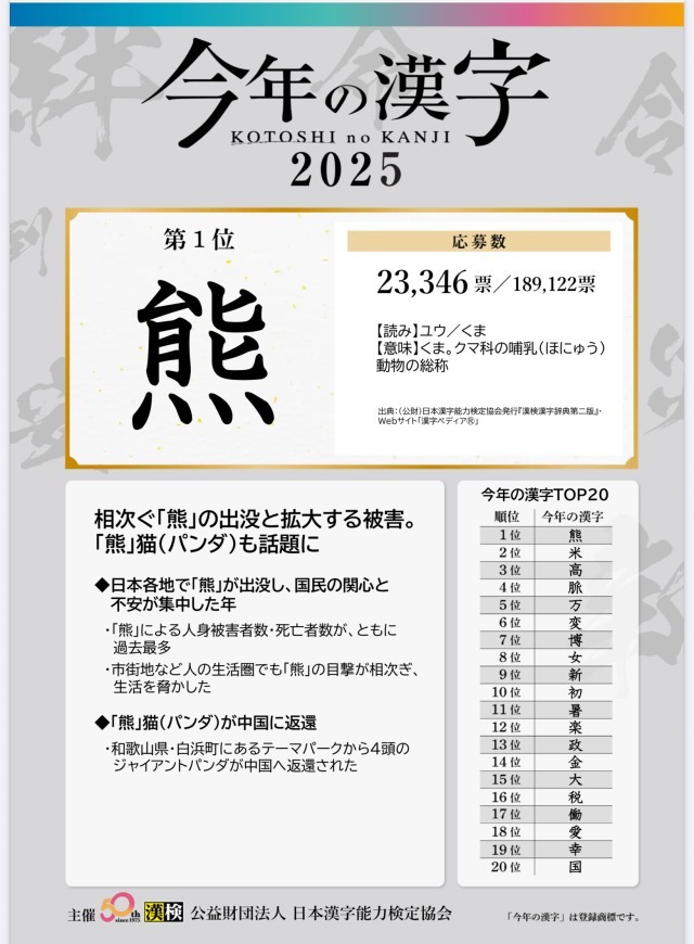 12/16(火)今年の漢字は「熊」 公開日 2025/12/16 更新日 2025/12/16 学校の様子 12月12日は「漢字の日」でした。図書室でも関連図書の展示をしていました。この日には、津田南小学校でも投票箱を設置していた【今年の漢字】の発表がありました。今年の漢字は、【熊】でしたね。クラスの子ども達と話題にしていたクラスもあったようです。 いいね(1)