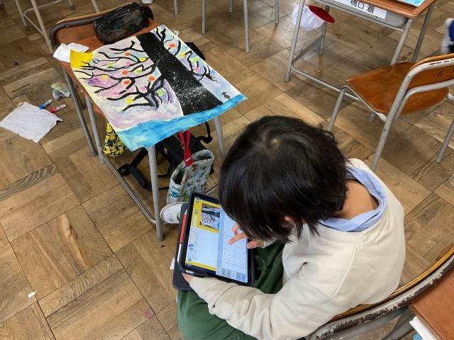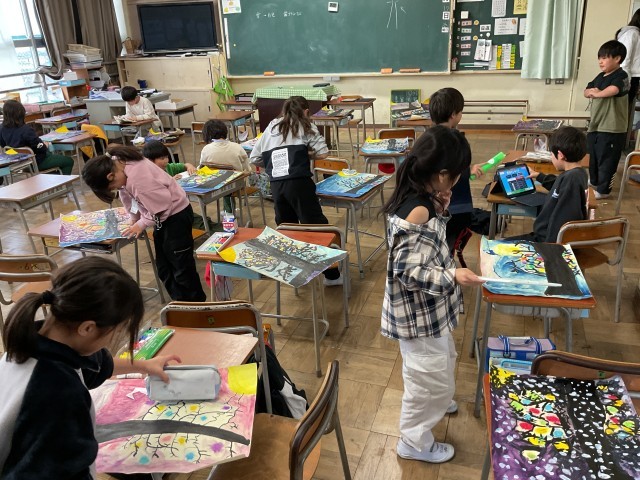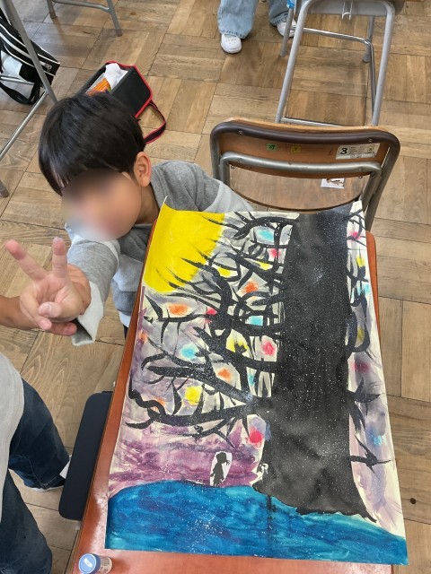 歯ブラシに白い絵の具をつけて、絵の具を飛ばす【スパッタリング】という技法を使って降りしきる雪を表現していました。