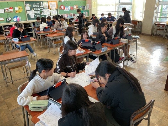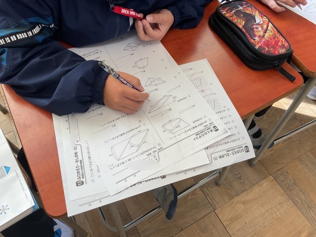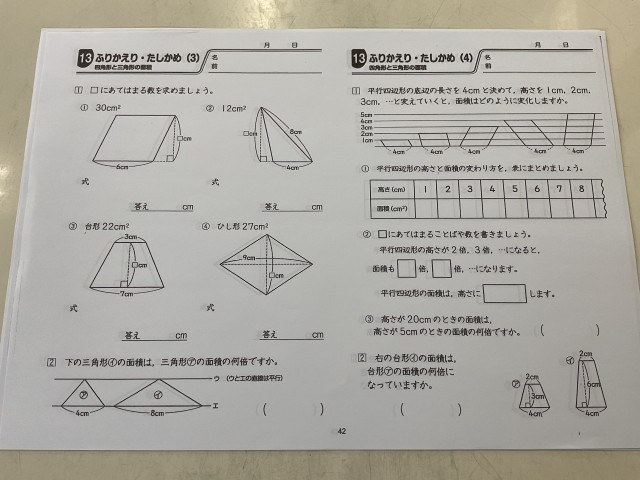 12/18(木)5年生 復習の時間① 公開日 2025/12/18 更新日 2025/12/18 5年生 学期末ですのでこれまで学習した面積の復習をしていました。平行四辺形、三角形、台形の面積の公式を駆使して取り組みます。底辺や高さを確認するためにプリントをくるくる回しながら取り組んでいました。なかなか頭の中で回転させるのは難しいですね。 +1 いいね(0)
