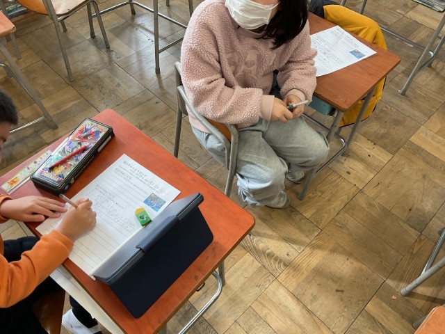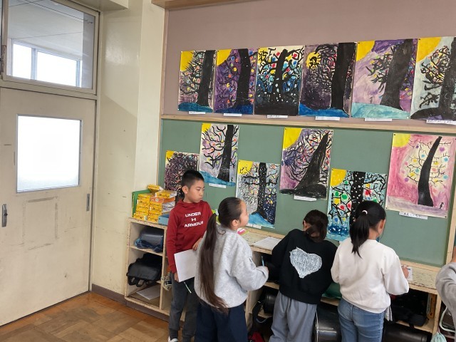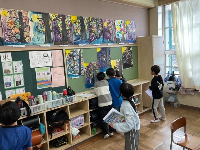 国語で学習した「もちもちの木」の絵画について鑑賞会を行いました。まずは、自分の作品の良いところを鑑賞カードに記入したら、友達の作品が掲示されているので作品を選んで良いところを記入します。みんなが真剣にお友達の作品の素晴らしさを味わっていました。