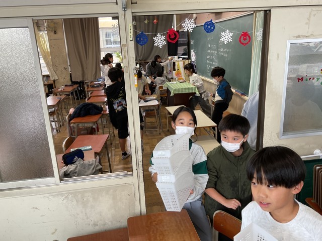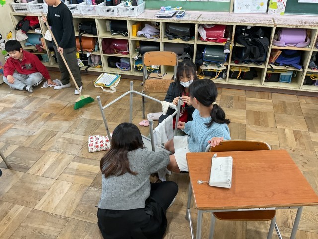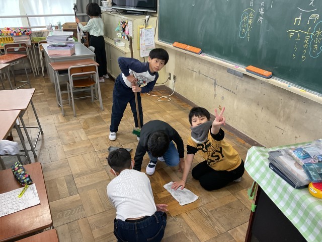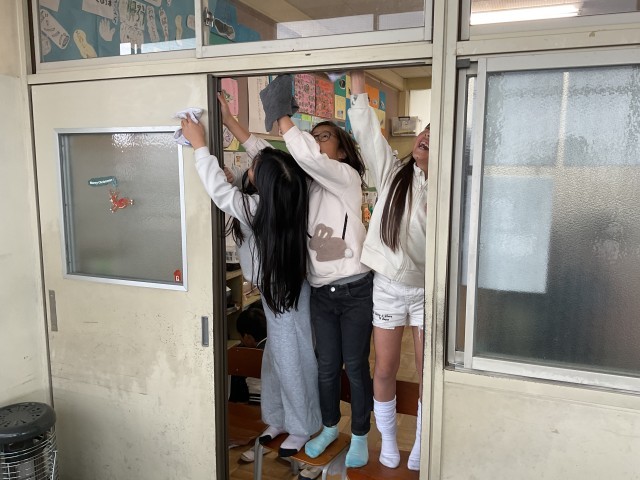 床や窓枠、机椅子の脚、エアコンのフィルターなどを一生懸命綺麗にしていました。教室で使っているマジックの書けるもの、書けないものの仕分けまでやっています。
