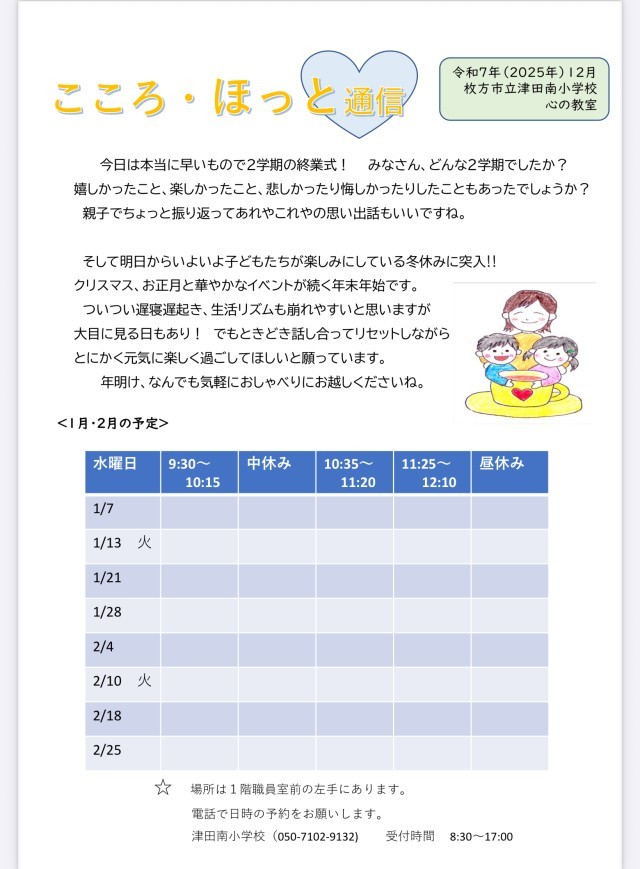 12/23(火)こころ・ほっと通信(1、2月予約分) 公開日 2025/12/23 更新日 2025/12/23 お知らせ・緊急連絡 こころ・ほっと通信(1、2月予約分)です。心の教室相談員による相談を希望する場合は、津田南小学校(050−7102−9132)にお電話ください。 いいね(0)