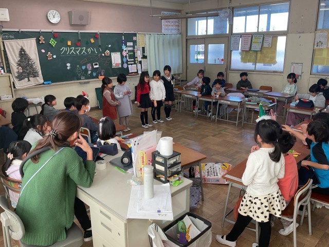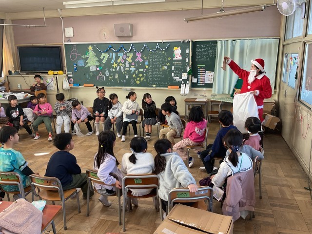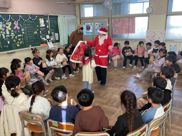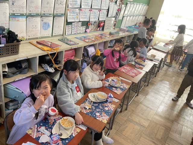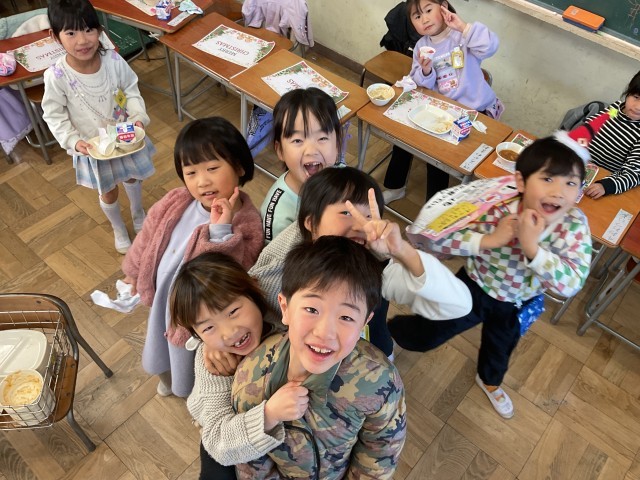 12/23(火)1年生 クリスマス会と給食の様子 公開日 2025/12/23 更新日 2025/12/23 1年生 クリスマス会では、サンタとトナカイが来た教室もあれば、にじの部屋で雪合戦をしていたクラスもありました。給食は、机を大きな⭕️の形に並べて食べていました。初めてのセレクトデザートはいかがでしたか? +3 いいね(0)