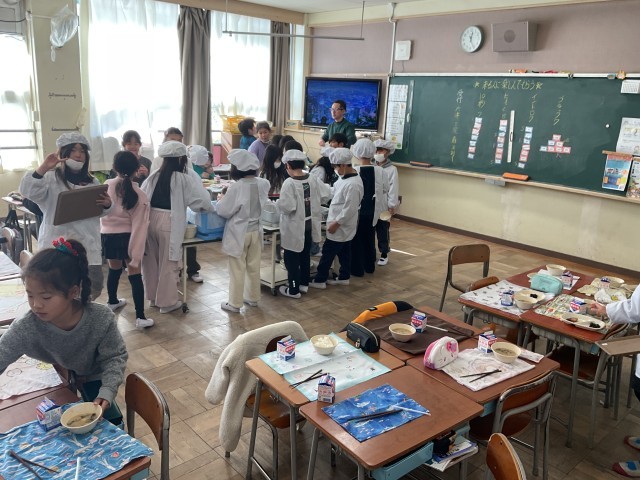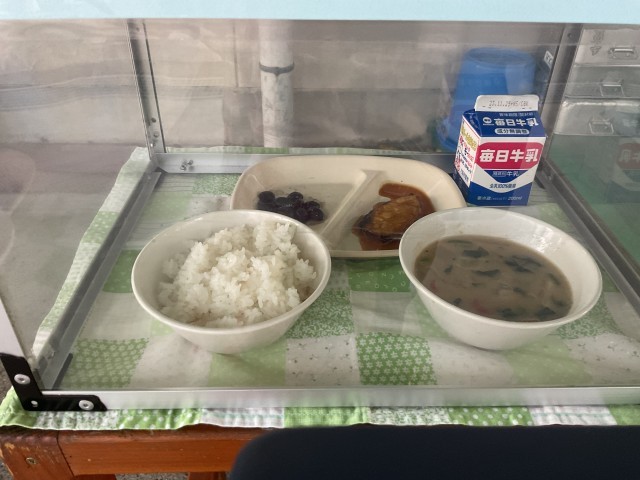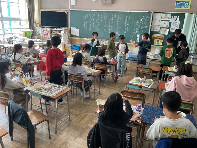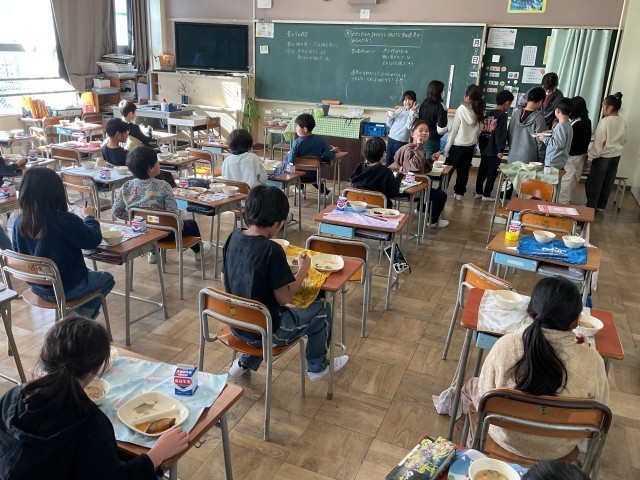 本年最初の給食はお正月に昔から食べられていた料理でした。黒豆にぶりと白味噌仕立てのお雑煮です。子どもたちも久しぶりの給食を楽しみにしている様子で、おかわりにたくさん並んでいました。