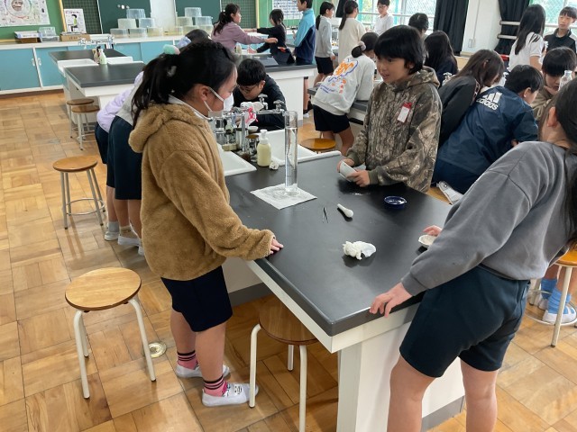 5年生3学期の理科は「水溶液の性質」について学んでいきます。今日は、第一時ということもあり、溶けるとはどういうことかグループで色々な物を水に入れて溶ける様子を観察していました。シュリーレン現象を確認できたかな?友だち同士で協力しながら各自で実験を行い楽しく学ぶことができた様子でした。