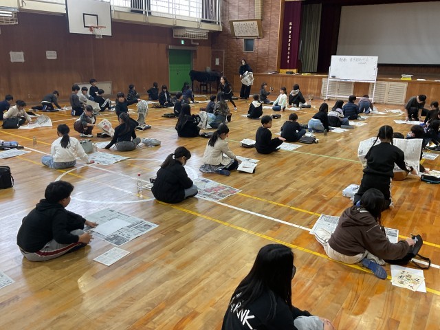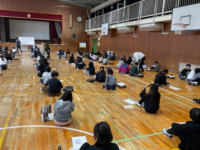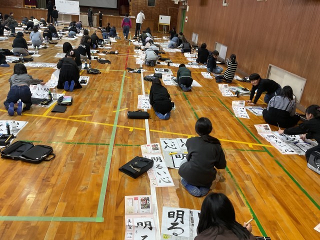 5・6時間目に4年生全員が体育館に集まって書き初め大会を開催していました。広々した体育館で学年全員が一斉に書き初めをする姿は迫力がありました。練習から本番と集中して取り組んでいました。