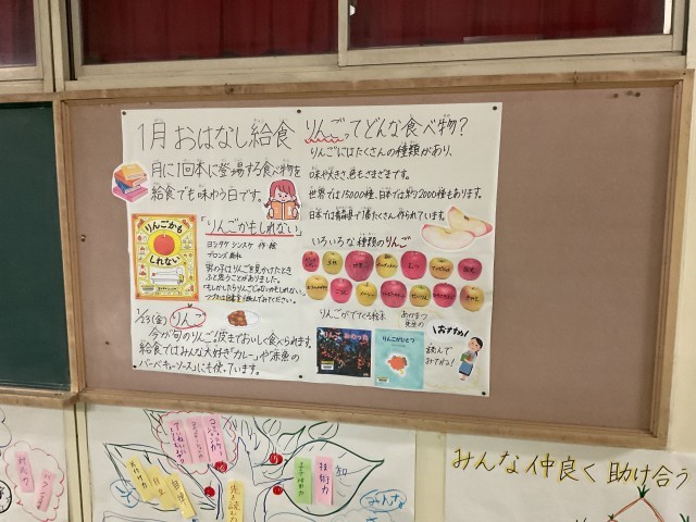1月も季節に応じた素晴らしい掲示物が校内のあちこちに飾られています。黒板に書かれてる詩や食育の掲示物、子ども達の冬休みの様子がわかる絵日記や新聞など、校内をとても明るく暖かくしてくれています。