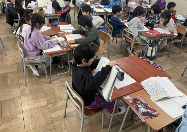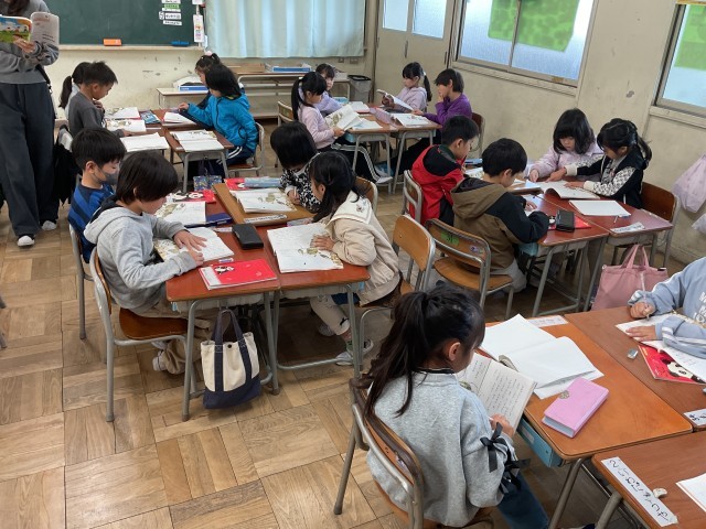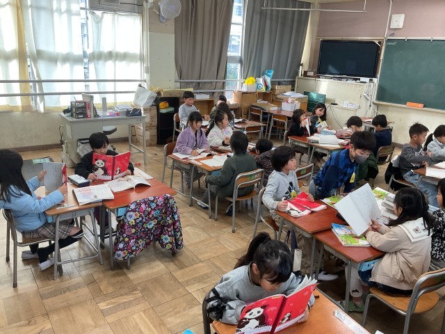 物語文のスイミーを、丸読みで区切りながらみんなで音読できました。文章を指でなぞりながら、自分の番が回ってきたら一生懸命に音読する姿が微笑ましいですね。その後、主人公のスイミーの人物像についてそれぞれが考えたことを班で交流し、全体で共有していきました。