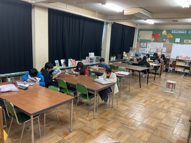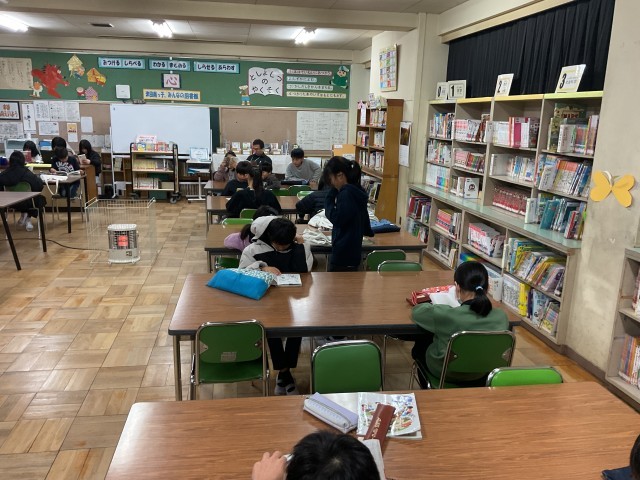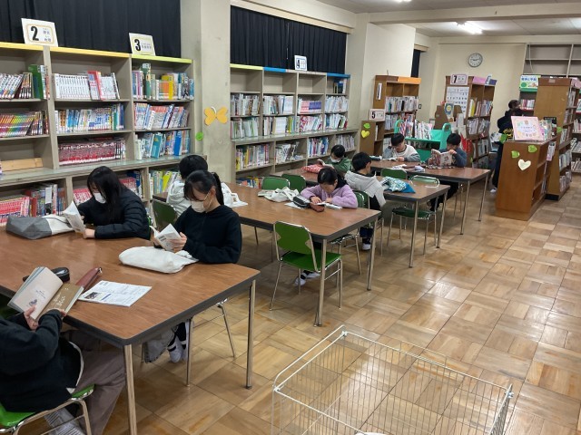 図書室の前を通ったら、とても集中して読書活動に取り組んでいる5年1組の子ども達の姿が大変素晴らしかったので、思わず静かな図書室に入ってその様子を写真に撮らせてもらいました。小さなシャッター音が響くくらい集中して取り組んでいました。担任の先生も前で一緒に読書をしていました。