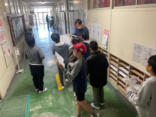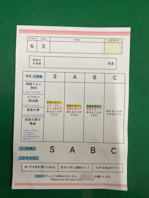 6年生が英語の授業で作ったスピーチを関係のある先生に披露し、評価してもらっています。