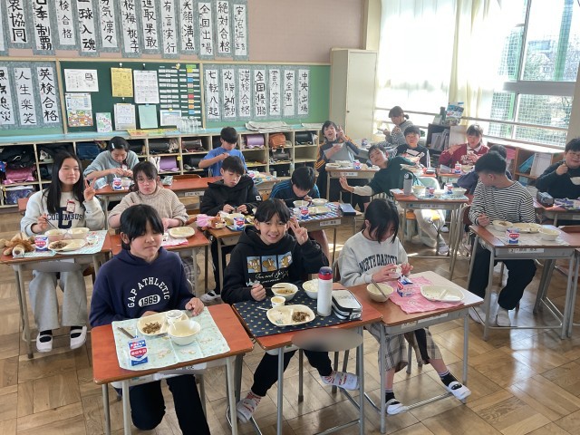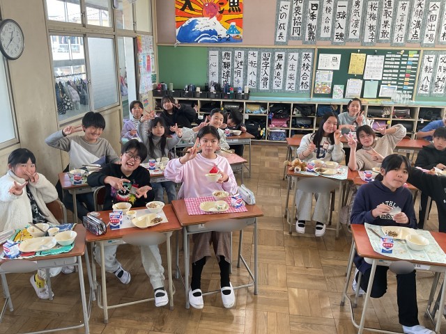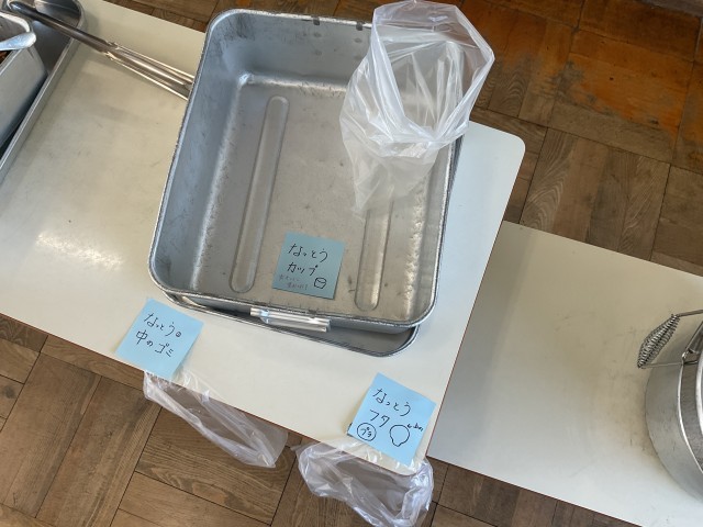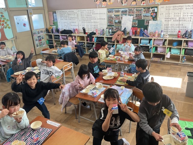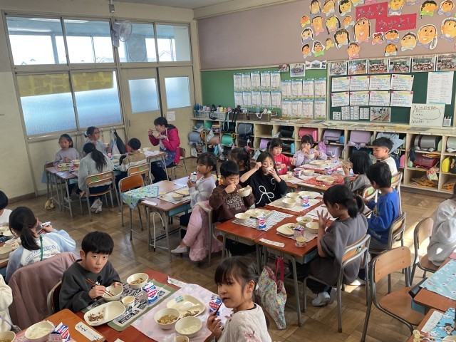 今日はなっとうが給食に出ました。1年生と5年生の教室に行ってみましたが、上手に食べられていました。