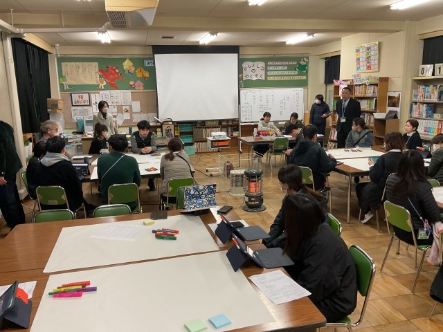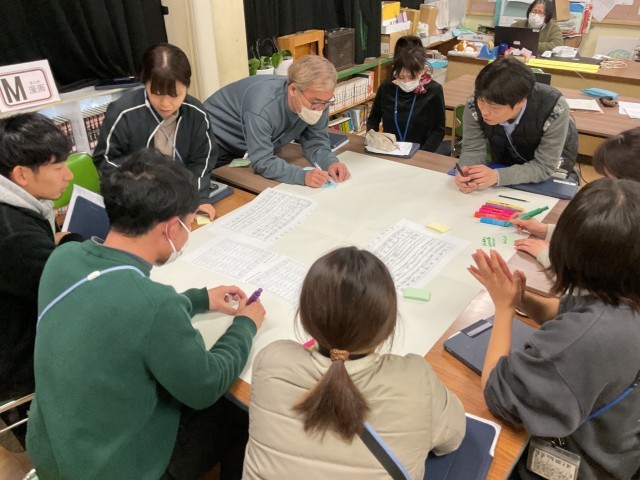 授業後には、この1年間講師として津田南小学校にご指導いただいてきた大阪教育大学の田村先生による本日の研究授業のご高評と探究学習に関する講義を聴き、本日の振り返りを行い次年度への見通しをもつことができました