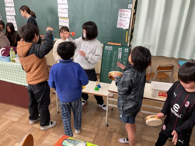 音が出ているときのものの様子を調べるため、教室には様々な楽器が並べられていました。子どもたちは班ごとに順番にまわりながら、その楽器を鳴らして音の出ているときのものの様子を手で触りながら確かめました。色々な音が響き渡る賑やかな授業の様子でした。