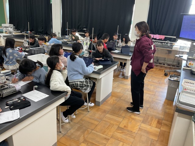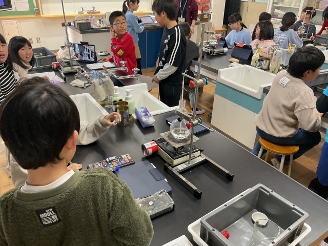 理科室で4年生が「水のすがた」の学習で実験をしています。フラスコや温度計、カセットコンロ等を用いて水を沸騰させ続けるとどうなるかを予想し時間や温度を測りながら熱心に実験をに取り組んでいました。実際にやってみて結果を出せることが理科の授業の醍醐味ですね。