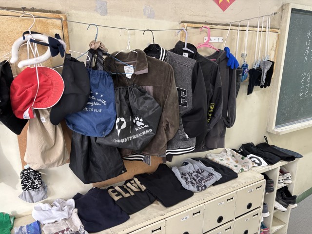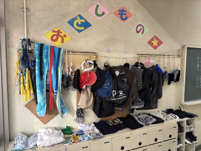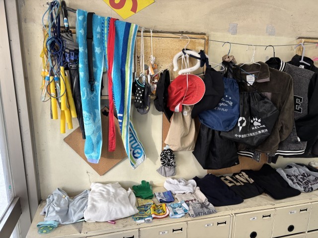 中庭に長机を出して今学期の忘れ物を展示していますので、ご確認ください。