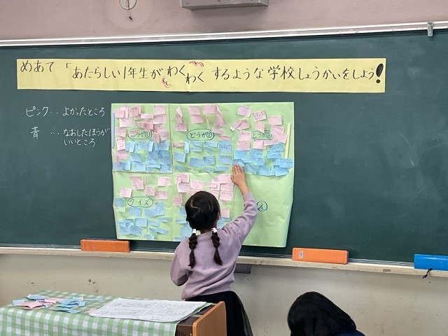 2/17(火)1年生 いよいよ学校しょうかいのリハーサルです 公開日 2026/02/17 更新日 2026/02/17 1年生 紙芝居と劇のグループのリハーサルの様子です。劇ではひらがなの「つ」を学習する様子を演じていました。紙芝居では力作の絵を使って説明をしていました。見ている子は、【いいところ】と【直したほうがいいところ】を付箋に書いてアドバイスしていました。アドバイスをいかして完成度を上げていきましょう!がんばれ!!1年生!!! +1 いいね(0)