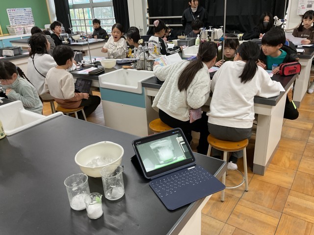2/20(金)4年生 水を冷やしたときの変化 公開日 2026/02/20 更新日 2026/02/20 4年生 寒剤(水と氷と食塩)を使って試験管内の水を凍らせる実験です。その様子をタブレットで撮影して記録していました。自分の班の実験をお休みの子が後で振り返ることができて大変便利ですね。水は0℃で凍ること、水は凍ると体積が増えること。しっかりまとめていました。 いいね(0)